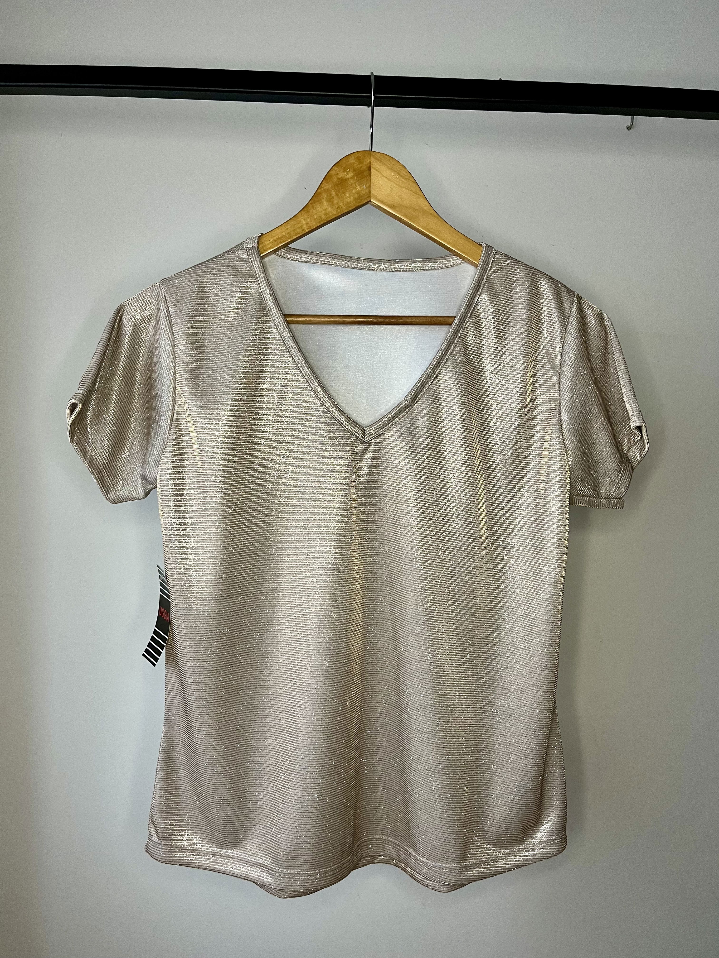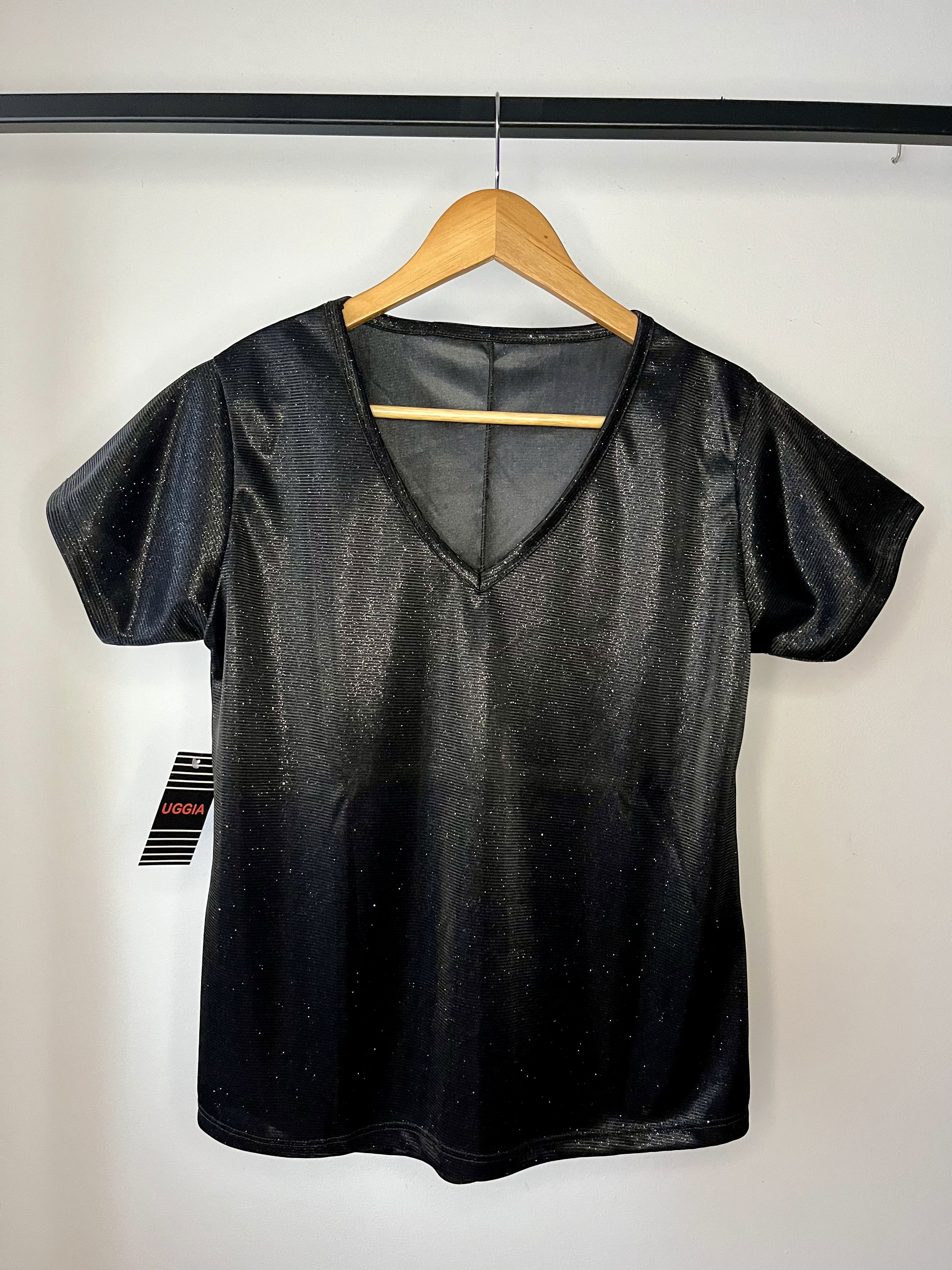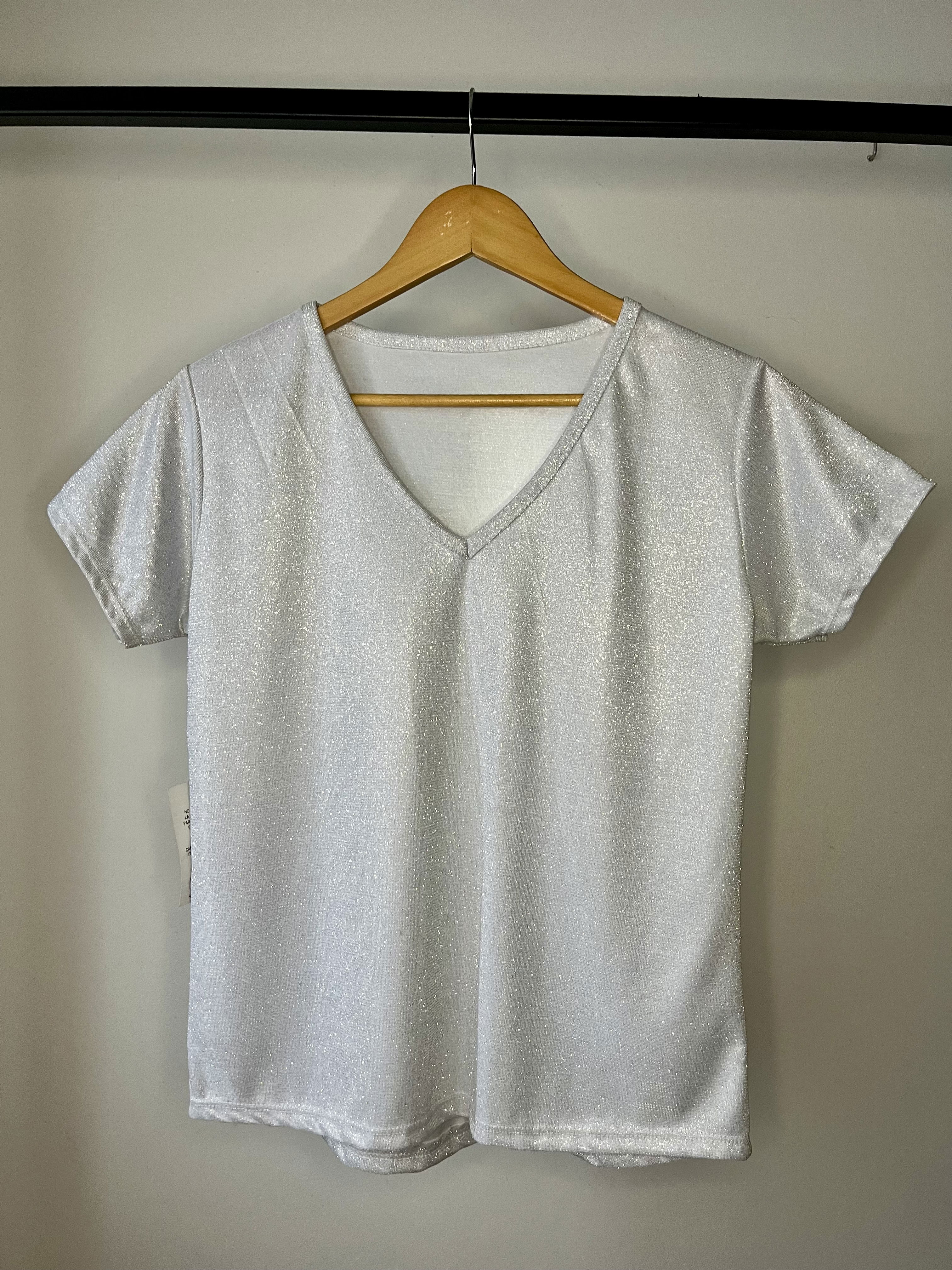 Diseño básico con escote en V. Tela completa con brillo, ideal para un look simple pero llamativo.