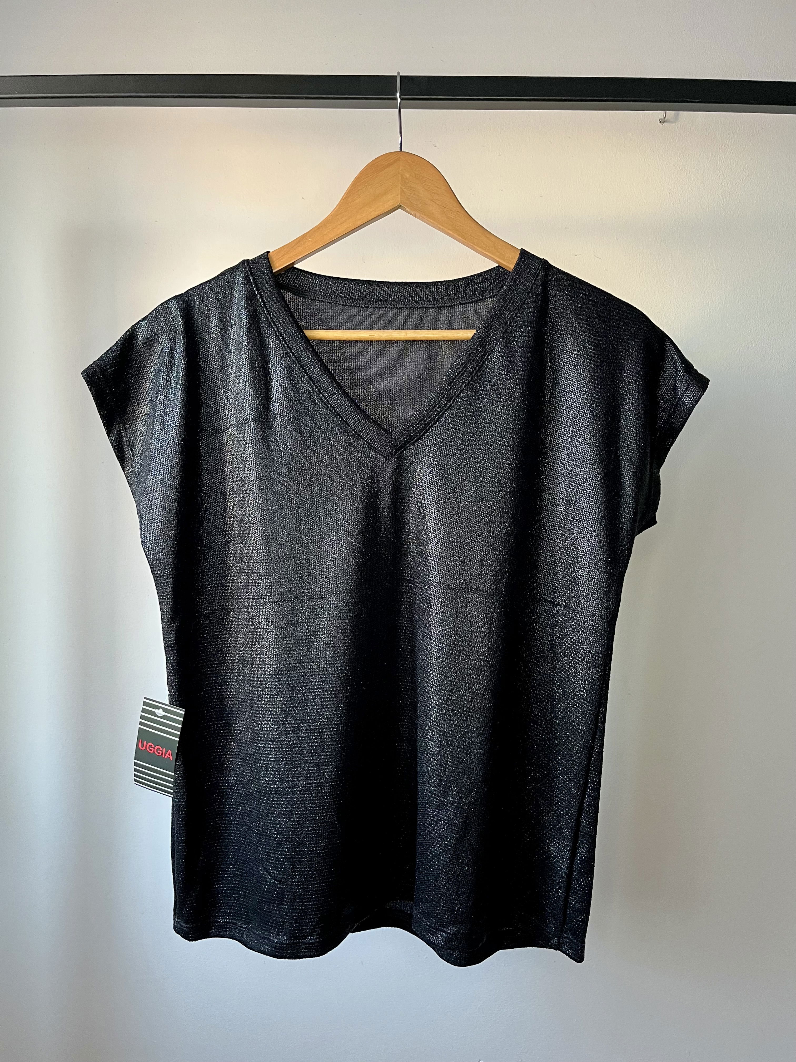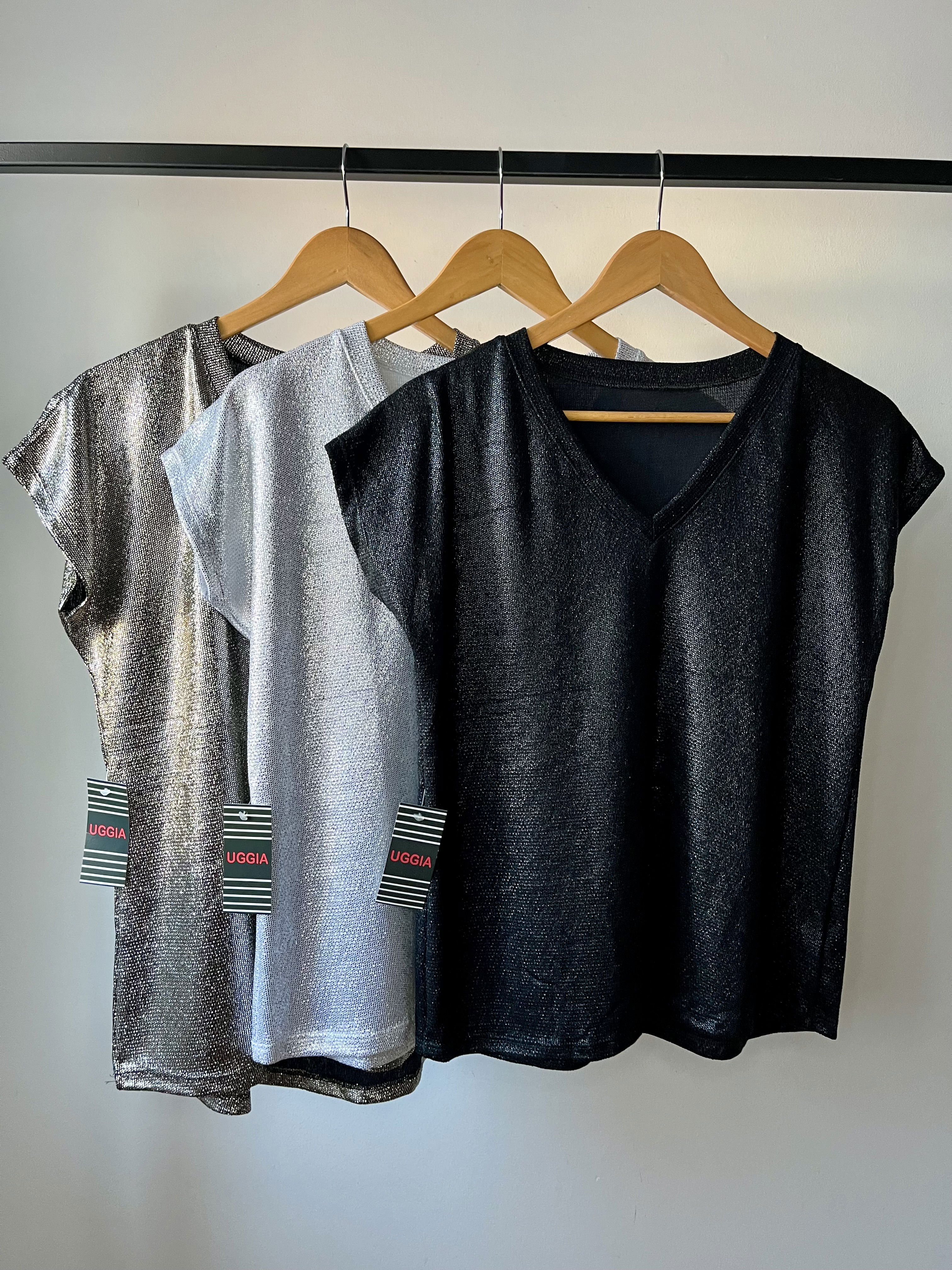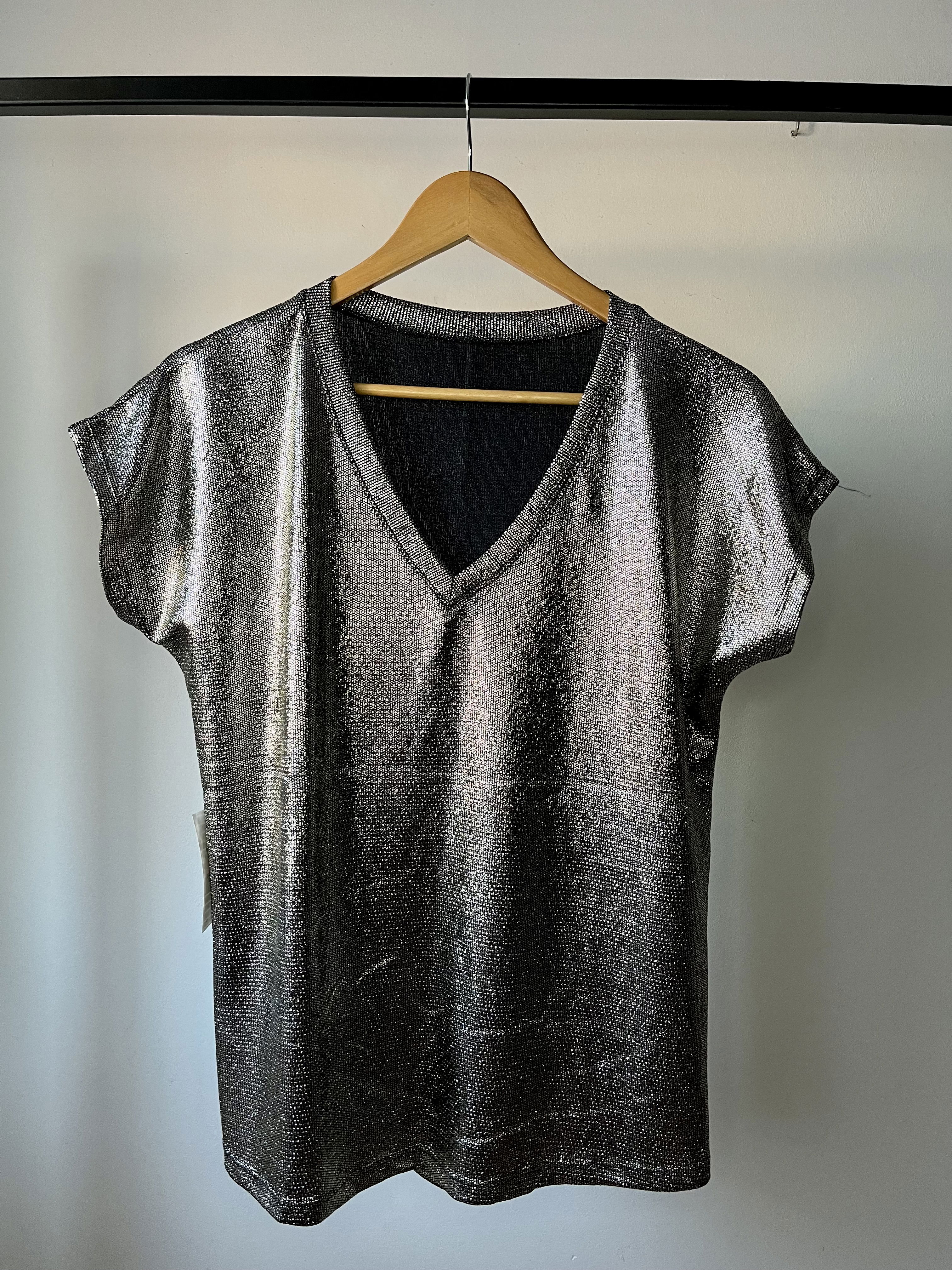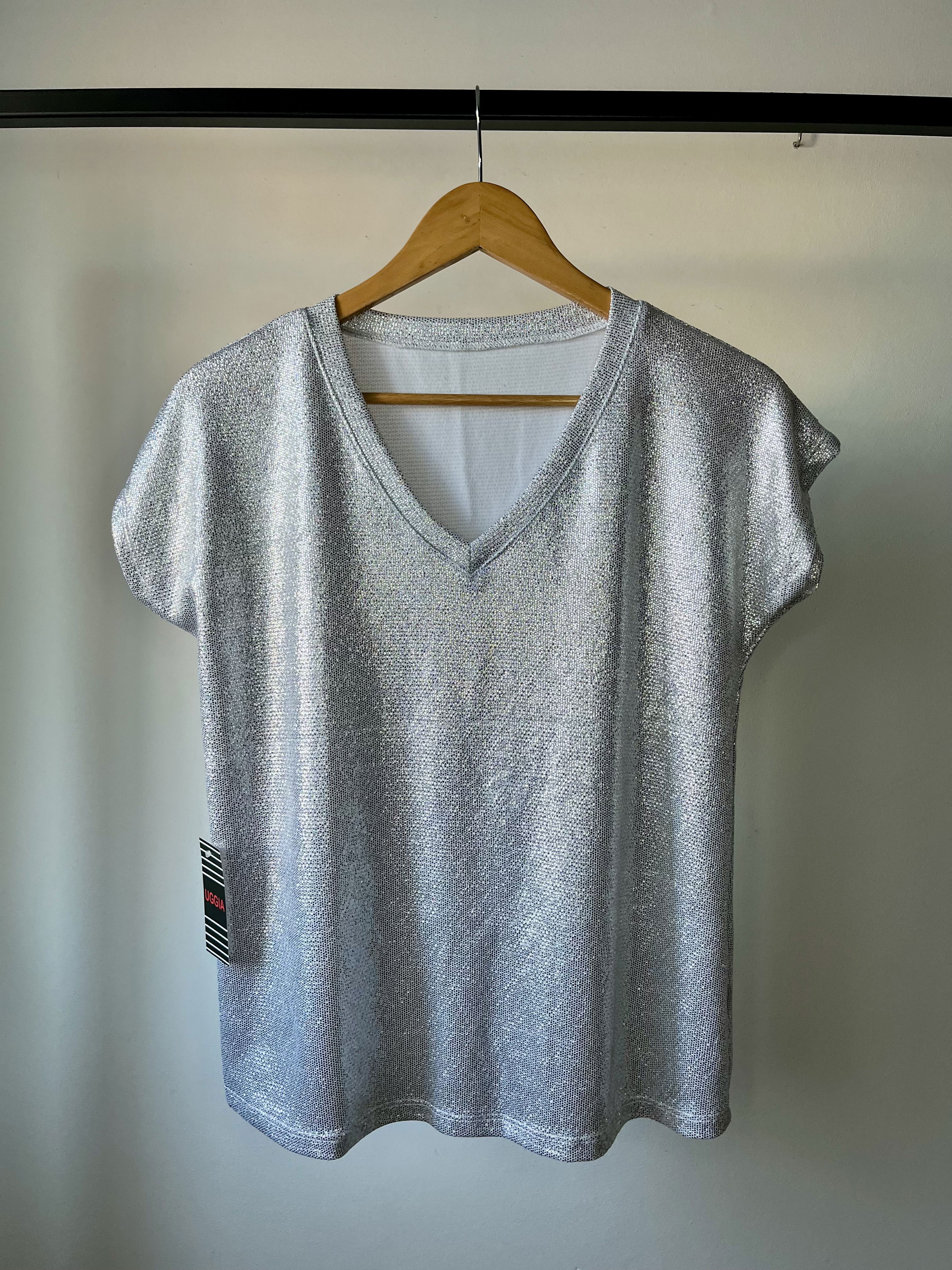 Remera confeccionada en tela brillosa. Liviana, suave y con acabado luminoso.